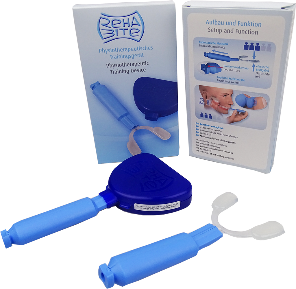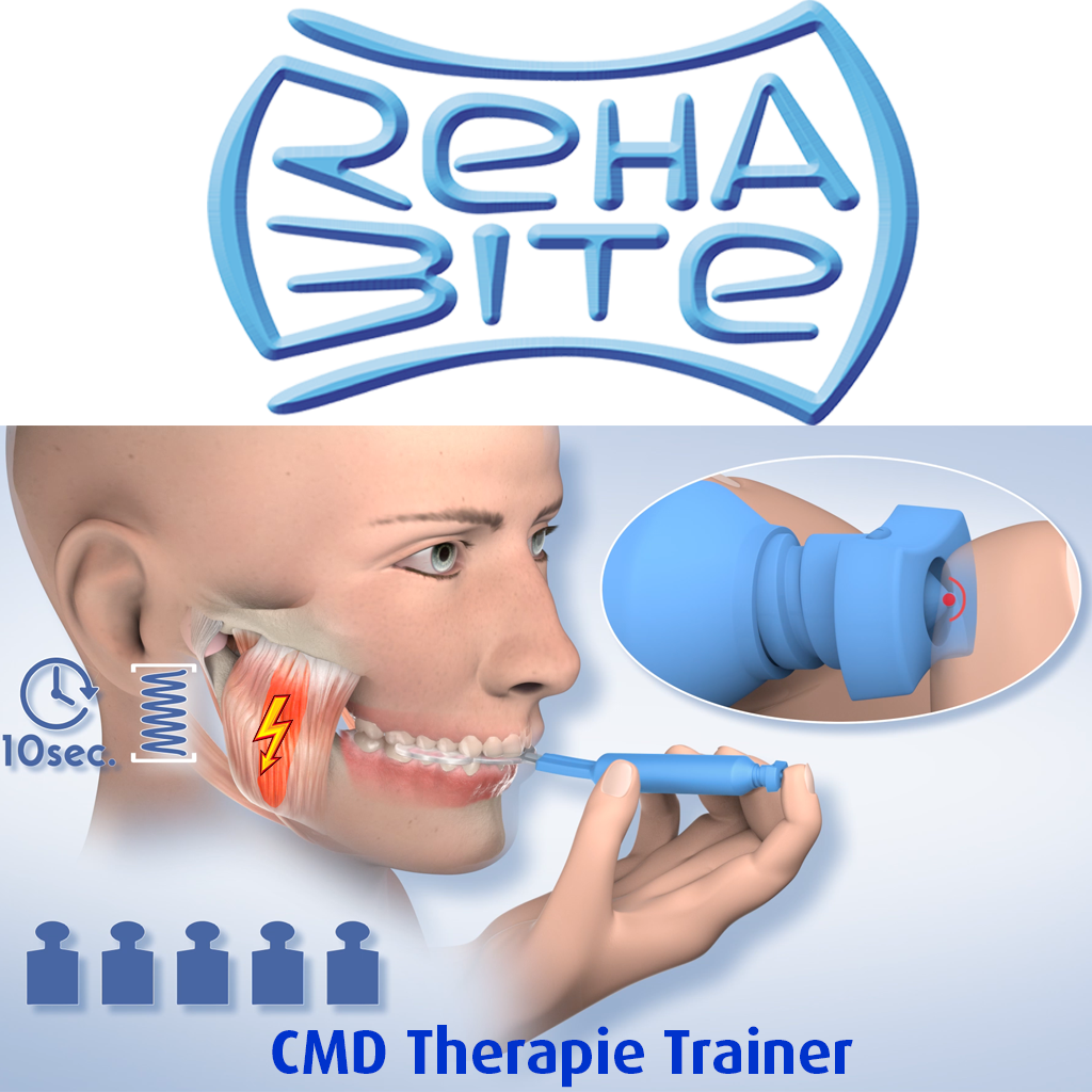 Der RehaBite ist ein Kaumuskel-Trainer, den Sie bei Beschwerden durch das CMD-Syndrom ganz einfach zu Hause anwenden können. Die mit Glycerin gefüllten elastischen Beißgabel löst Muskelverspannungen und Schonhaltungen im Kiefergelenk. Sie können ihn als Alternative zur Therapie mit Medikamenten und der Okklusiosschiene einsetzen.